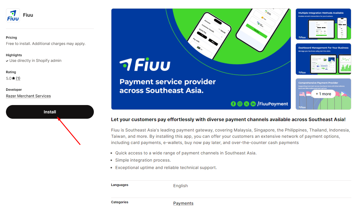 Step 1: Head to the Fiuu Payment App on Shopify App Store.